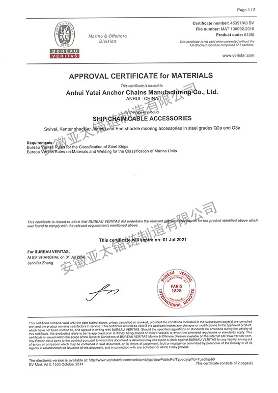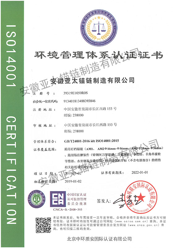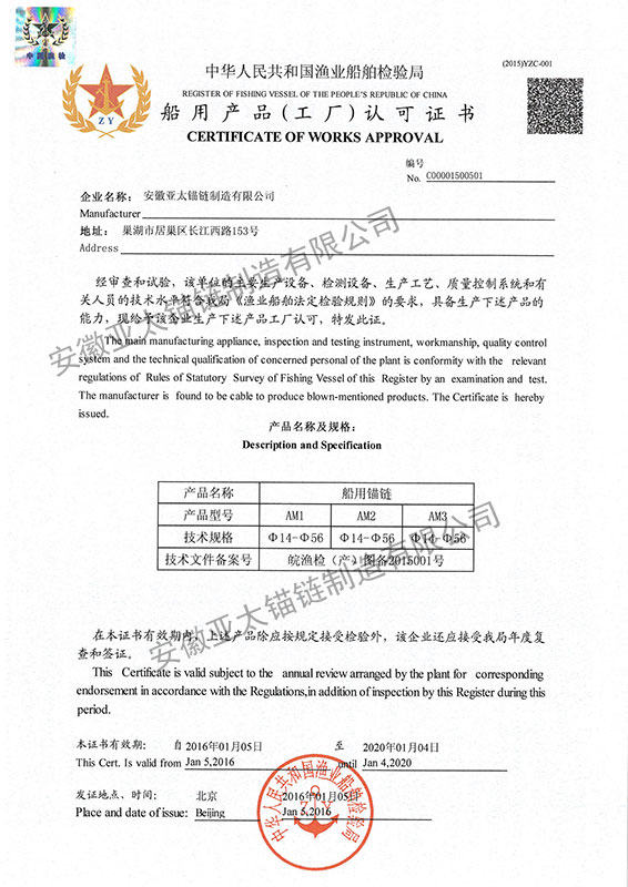 安徽亞太錨鏈制造有限公司是國家高新技術企業(yè),也是國家GB/T 549-2017《電焊錨鏈》標準的起草和制定單位之一。公司旗下設有錨鏈分廠、浮標分廠、舾裝件分廠等多個分廠。公司專業(yè)從事φ12.5mm-φ107mm二、三級船用錨鏈、浮標錨鏈、錨鏈附件,錨、船舶曬裝產(chǎn)品、航標、系船浮、船型標、多種規(guī)格海洋監(jiān)測浮標及航標燈等產(chǎn)品的生產(chǎn)、安裝和服務。目前公司的產(chǎn)品銷往全國各地船廠、碼頭、航標處、航道局、海洋局,并已走上國際市場,如東南亞、中東、歐美等國家。